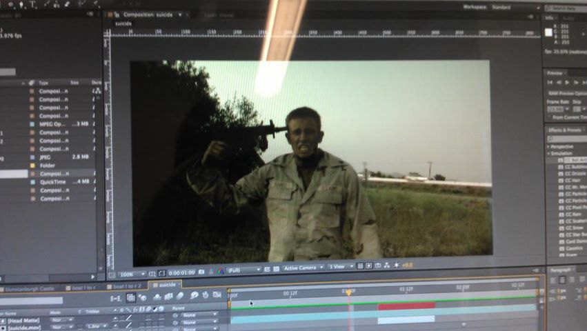During the week’s course we had to undertake an exercise in making a man look like he was actually blowing his own brains out. Now the footage provided was of a young bloke (I’ll call him Kurt) pretending to shoot some sort of automatic rifle at his head then falling over. We learned to digitally remove his head at the correct point, add gun flashes, blood splashes with accompanying sound effects of gun blasts and squelching sounds.